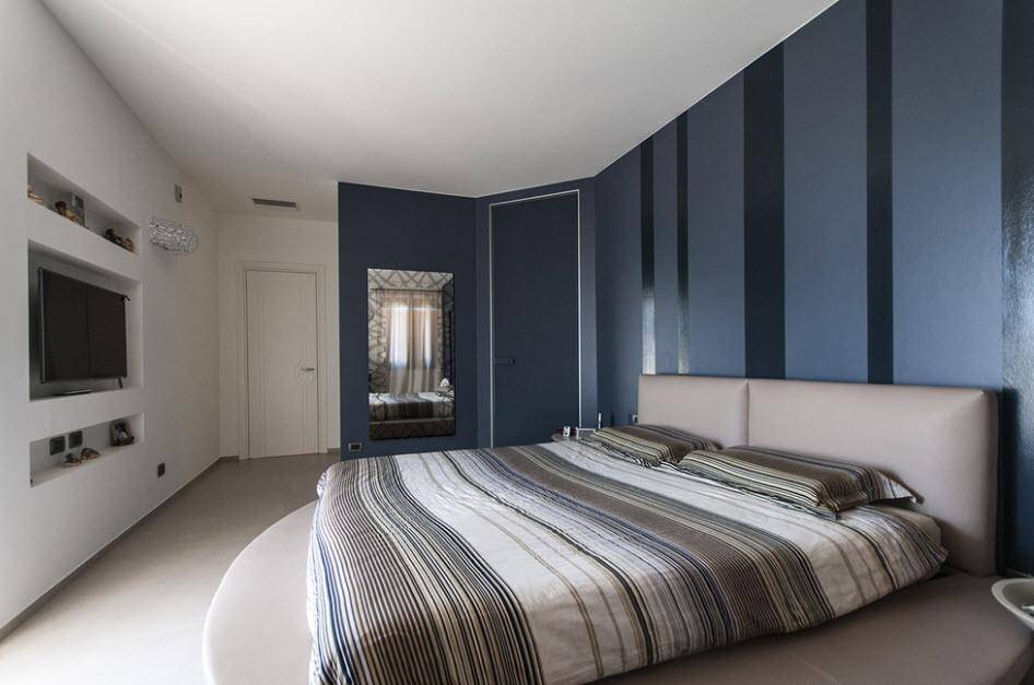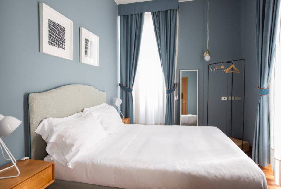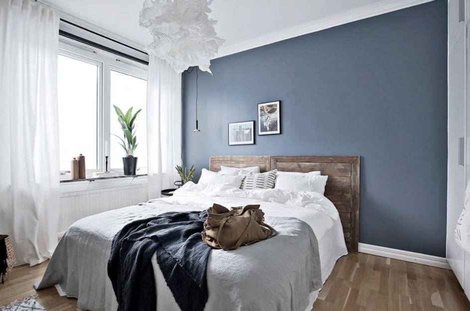 Спальня получается просторной, воздушной, а теплый коричневый уравновешивает холодный голубой. Если помещение небольшое, стоит использовать теплые оттенки: бирюзовый, серо-голубой. Не переусердствуйте с орнаментами: если обои однотонные – можно использовать пестрый текстиль, но на фоне яркой акцентной стены лучше смотрятся однотонные ткани. Третьим цветом можно выбрать белый, серый или бежевый.