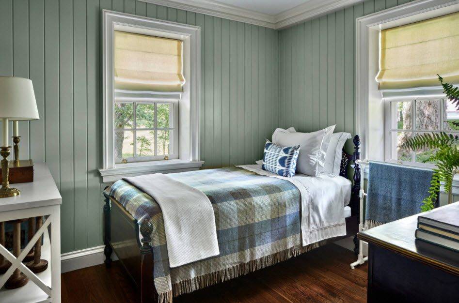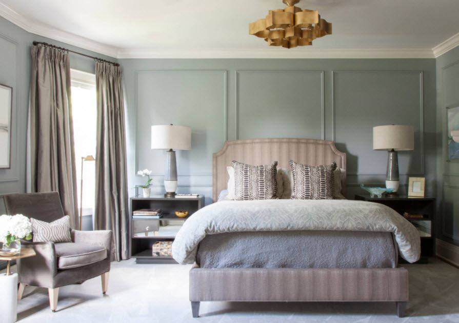 Еще одна популярная тенденция — спальня в сером с мятой. Зеленоватый цвет привносит свежесть в дом и особенно хорошо связан с серым. Комната может быть оформлена с небольшим количеством белого или бежевого.