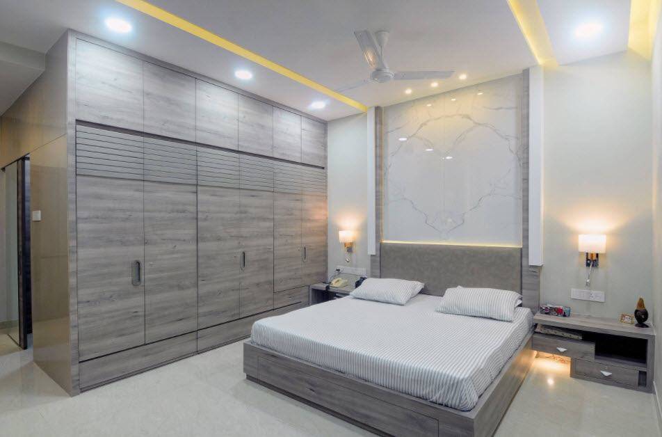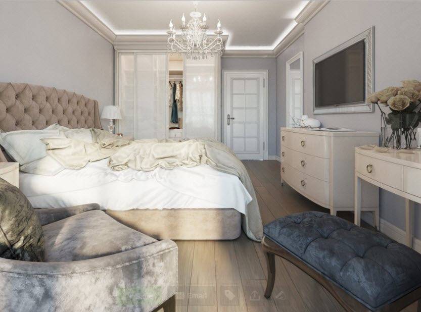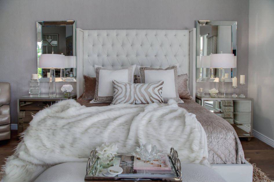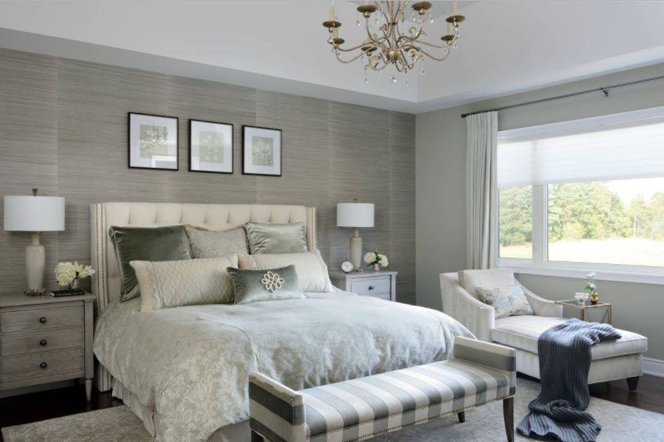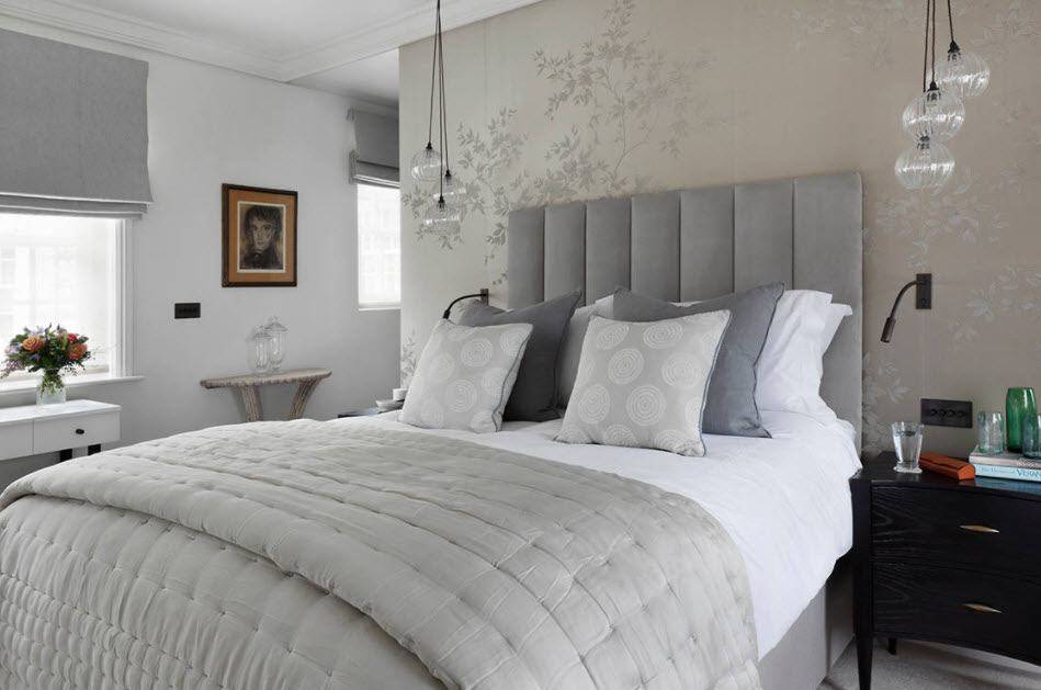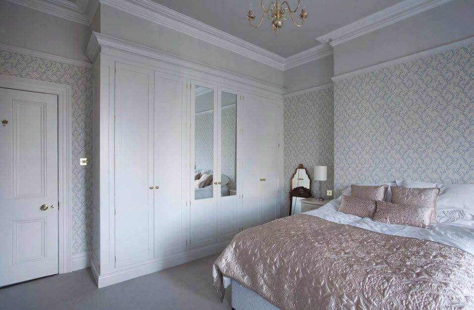 Для нежного дизайна спальни стоит выбрать серо-белый цвет обоев, пола и даже бельевого шкафа — такой дизайн станет идеальным фоном для любого выбора постельного белья, будь то однотонное или фантазийное, уйти просто невозможно неправильный.