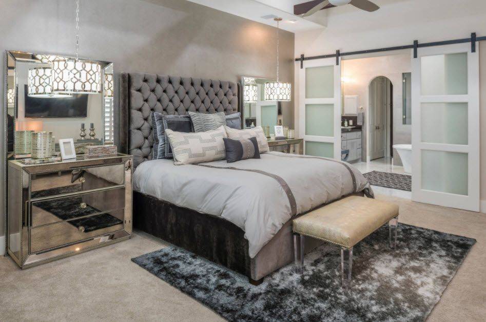 Серую спальню можно сделать более роскошной с помощью серебряных аксессуаров. Больше всего впечатляет большое прямоугольное зеркало в декоративной рамке. В сочетании с черной вешалкой он образует небольшой уголок, заменяющий шкаф. Сверкающие аксессуары превращают серую комнату из серой и бесцветной в элегантную и утонченную.