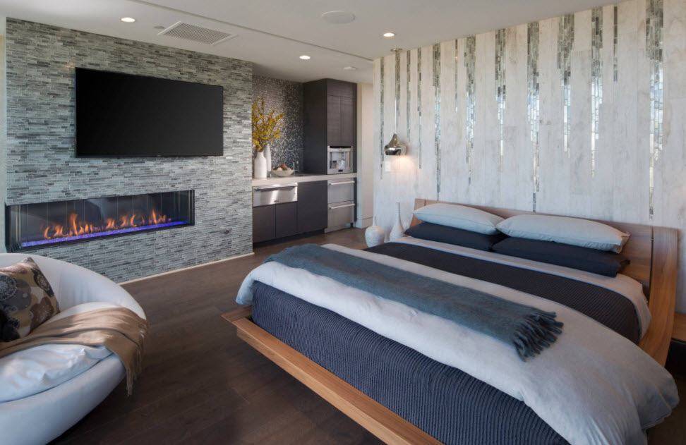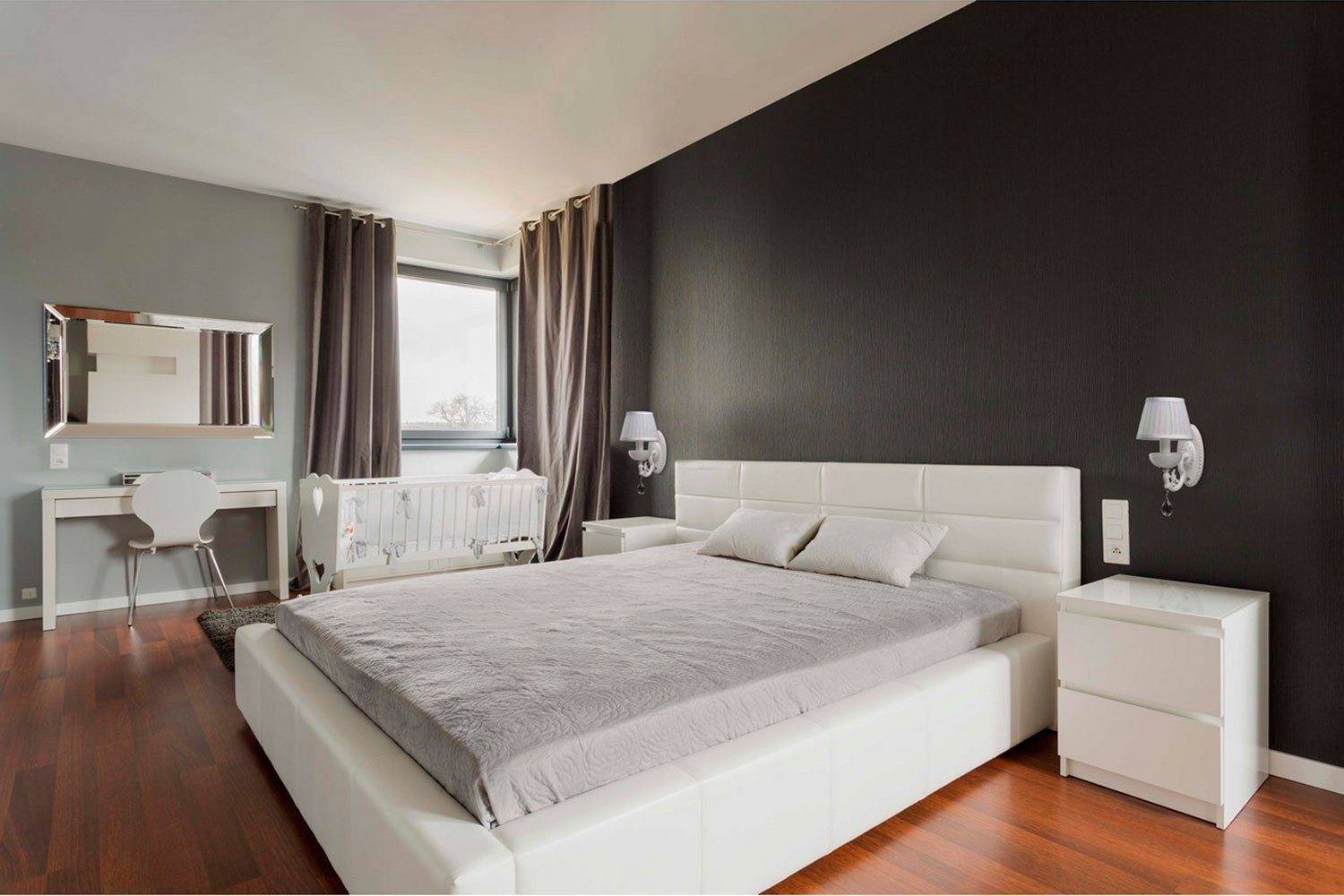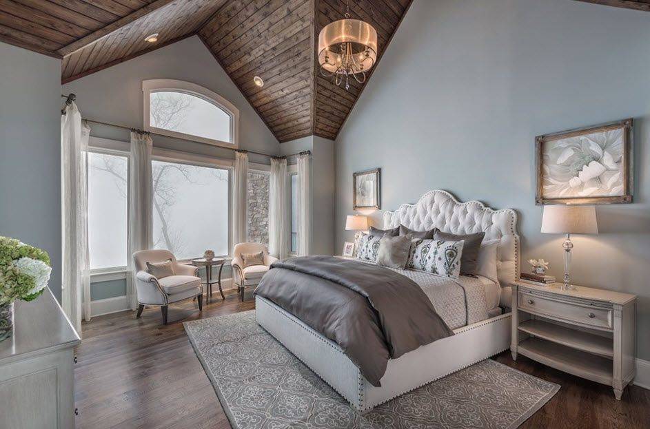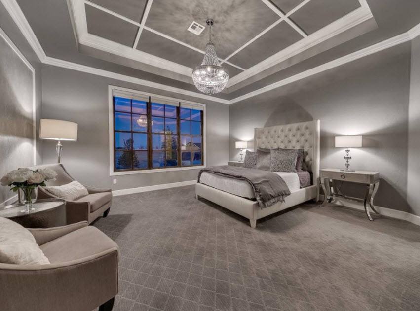 Как бы это банально не звучало, серый цвет в интерьере всегда выглядит очень выигрышно. Можно оформить спальню в исключительно светлых тонах серого, либо затемнить обширное пространство, выделив лишь акцентную стену.