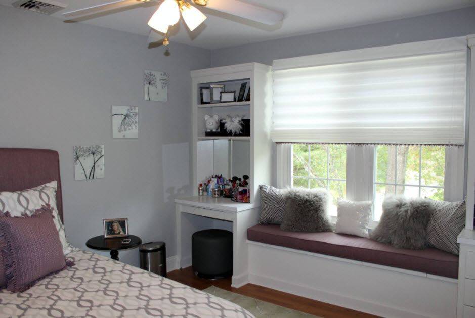 Для женской спальни желательно подобрать декор в белой гамме. Он привнесёт в помещение свежесть и чистоту. Изъявить поддержку серым стенам может аналогичного тона покрывало на кровати, ковёр на полу, подушка на стуле.
