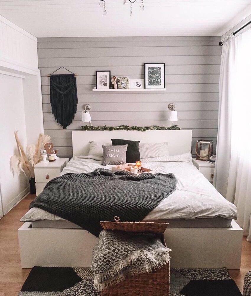 Чтобы спальня выглядела уютно, следует добавить текстурный текстиль, гирлянды или живые растения.