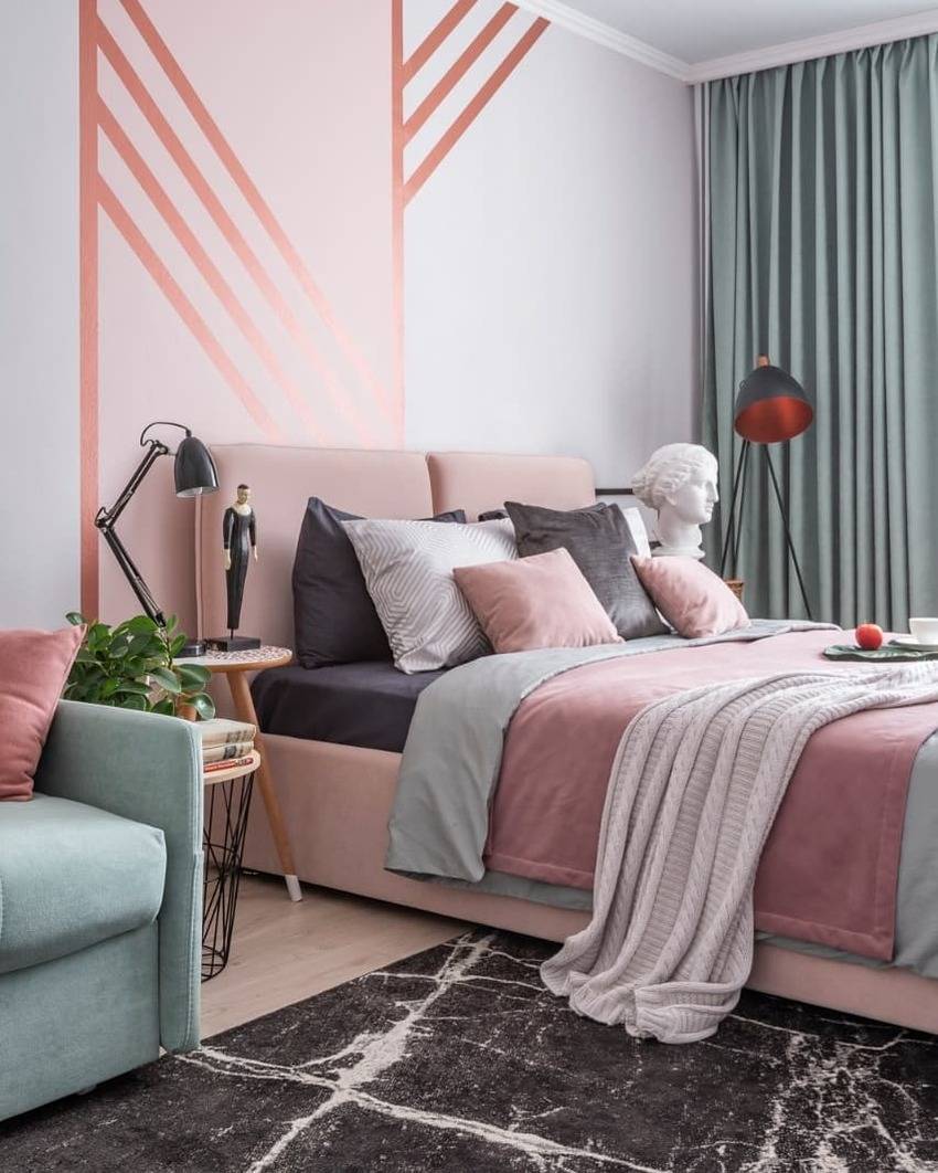 Розовая. Чуть менее актуальный цвет, зато позволяющий добиться оригинальности в дизайне спальни