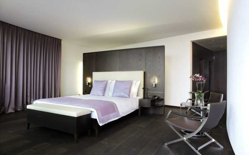 Простые формы. Все предметы должны быть установлены на тонкие ножки, а также иметь правильные очертания. Такая мебель выглядит современно и не будет утяжелять интерьер. В качестве акцента в спальне можно установить круглую кровать, комоды, похожие на куб, подвесной столик или кресла вытянутой формы.