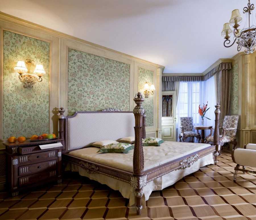 Изобилует тканями. Ею не только обивают мебель, но и затягивают потолки и закрывают стены. При этом создаётся атмосфера элегантности и лёгкости в сочетании с добротностью.