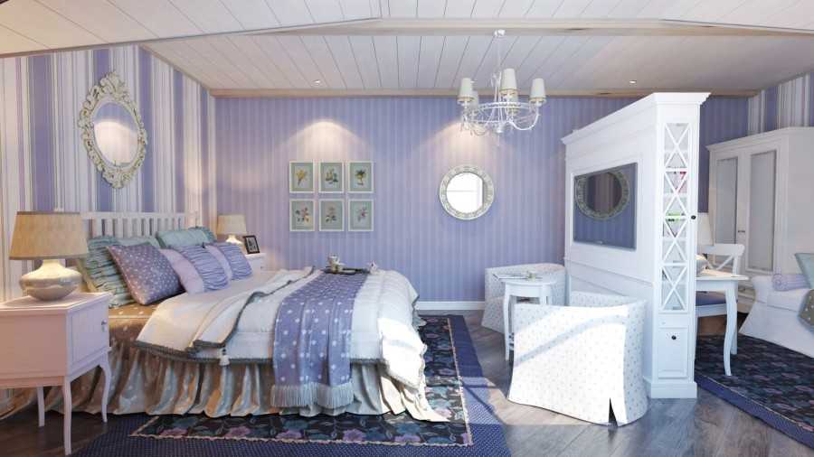 Натуральный текстиль представлен в обилии, что проявляется в легких занавесках, шерстяных покрывалах, вышитых подушках, скатертях с оборками, коврах. Все элементы должны быть выполнены в светлых тонах. Приветствуется материал в клетку, горошек и цветочек.
