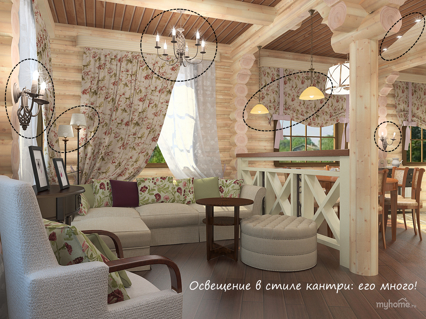 Освещение предполагает использование потолочной люстры, но в дополнение к ней обычно продумывают и другие, более камерные сценарии, с использованием торшеров, бра, настольных ламп с абажурами. В кантри гостиной источником света и тепла может быть в том числе камин или печь.