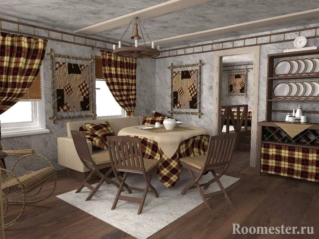 Простая, добротная, солидная мебель из дерева украшена вставками из меди, латуни, бронзы, патины. Каменные камины с полками – практически обязательный атрибут, как и балки на потолке. Диваны и кресла часто обтянуты кожей. Массивные обеденные столы, как правило, с круглой или овальной столешницей. Разноцветные, часто лоскутные одеяла, покрывала, напольные и настенные коврики создают настроение. В роли ковра часто выступает шкура животного, а стены украшаются рогами.
