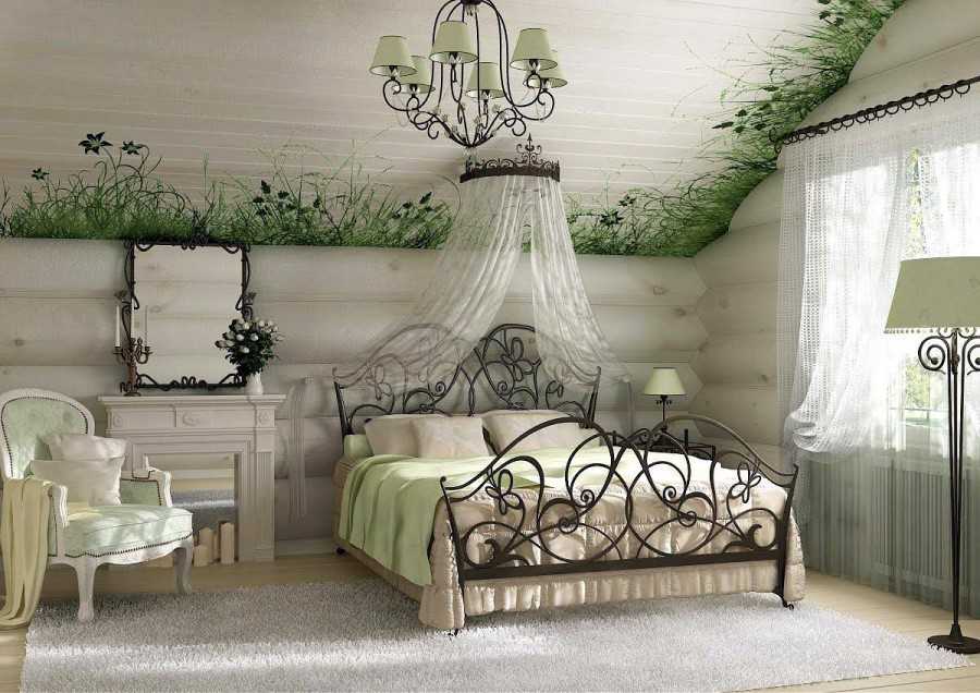 При желании можно вмонтировать в стену декоративный камин. На готовые стены в сельской спальне можно повесить декоративные блюдца, макраме, старые часы, чеканку, картины.