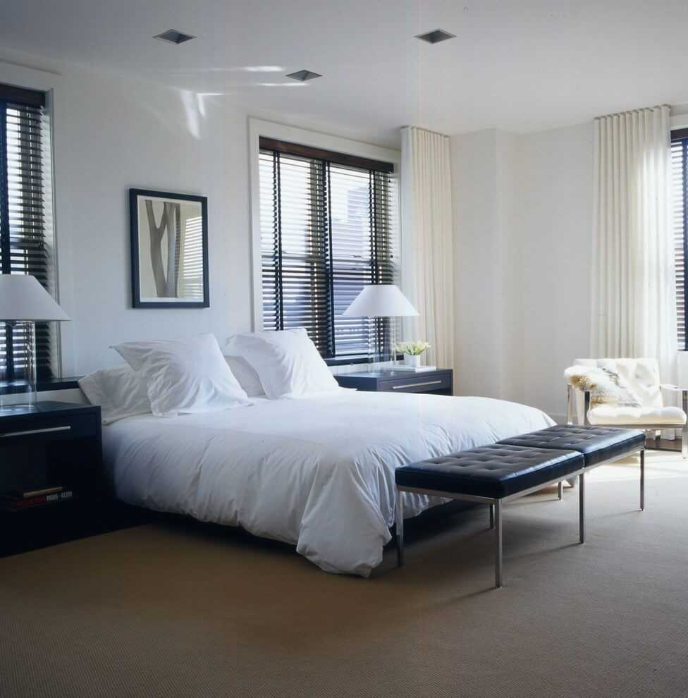 интерьер спальни в светлых тонах будет строиться на контрасте белого и