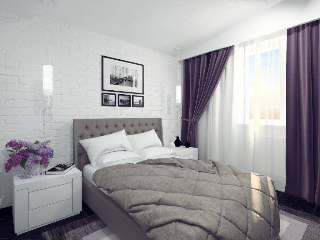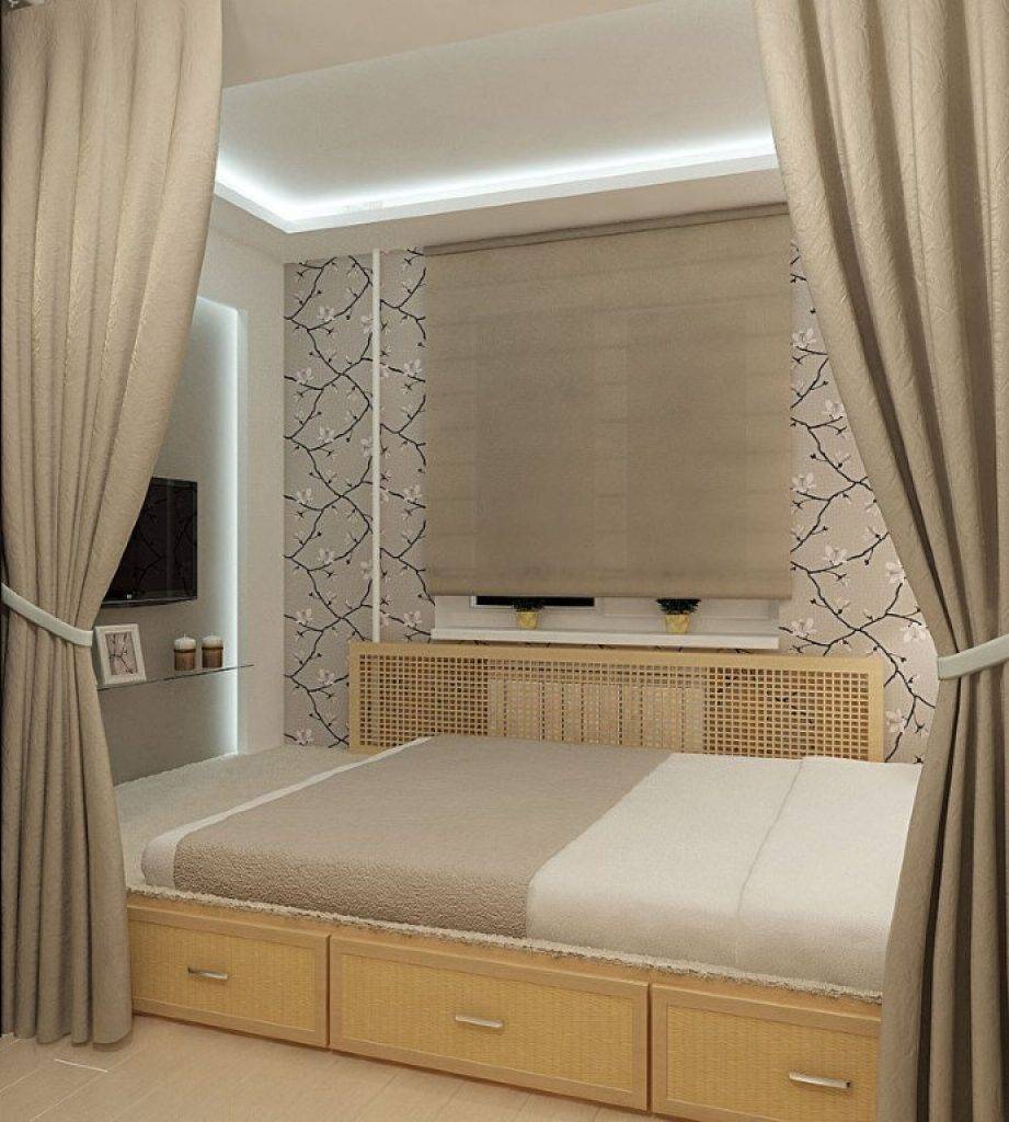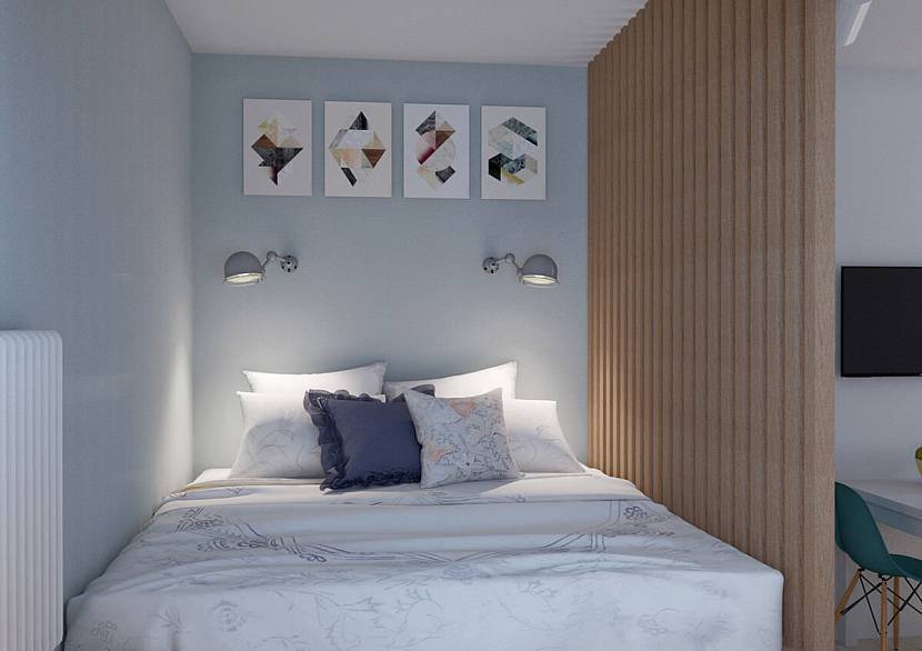 Несмотря на маленькую площадь, дизайнеры не советуют ставить кровать длинной стороной вплотную к стене. Гораздо элегантнее выглядит кровать с изголовьем у стены, по бокам которой стоят прикроватные тумбочки (или столики) с индивидуальным освещением. При таком расположении логичным, экономящим место, шагом будет размещение телевизора на противоположной от изголовья стене.