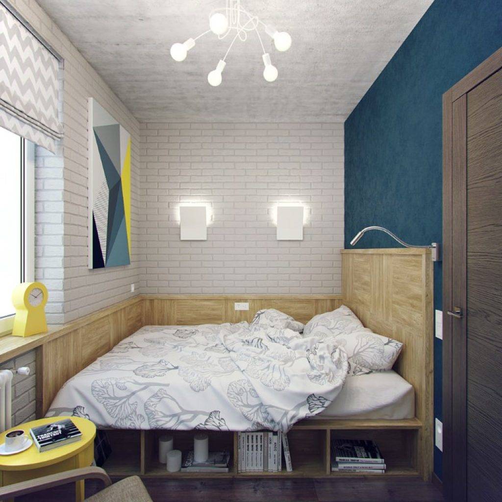 Лофт. Промышленный стиль в маленьких спальнях 3х3 м используется дозировано. Оформляется акцентная стена с имитацией кирпичной кладки, причем лучший вид будет у белой поверхности. В отделке используется дерево, стекло, металл. Цвета отделки подбираются спокойные: белый, песочный, оттенки серого и синего.