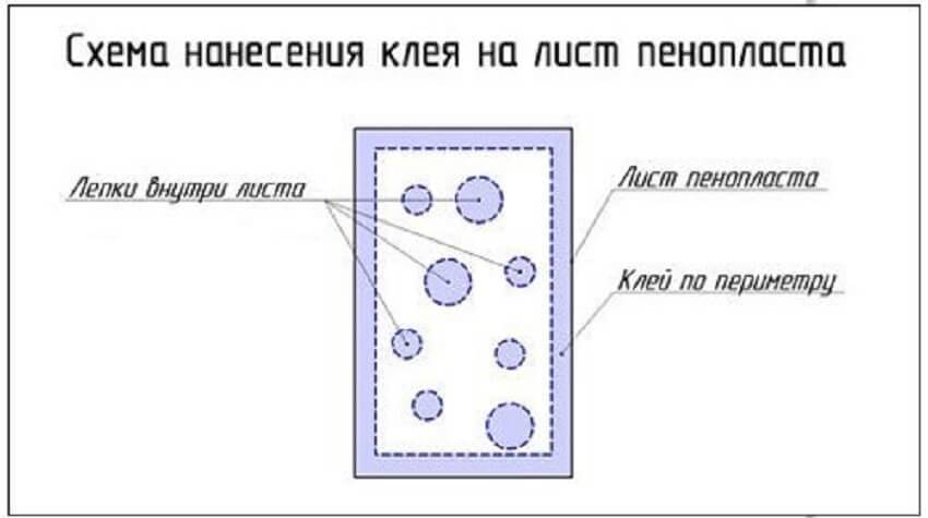- лист пенопласта обрабатывается клеем по периметру и в нескольких местах по всей его площади;