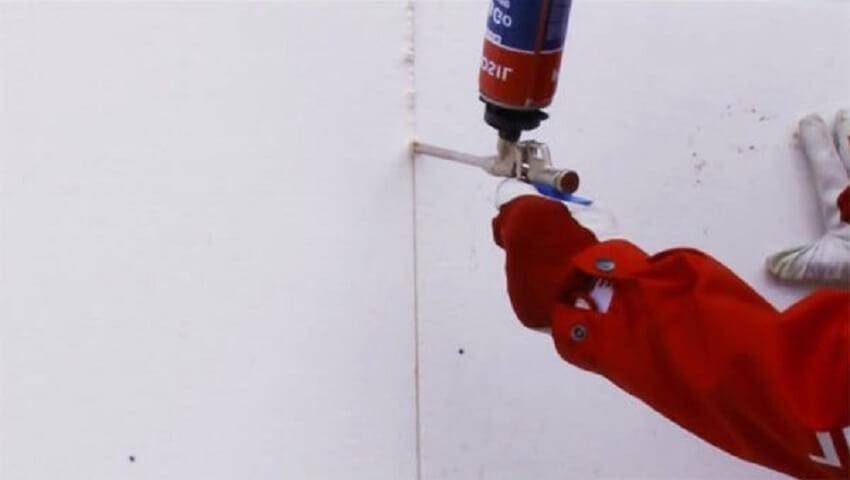 После должного крепления, требуется качественно заделать стыки между листами. Для этого, как правило, используют монтажную пену. Излишки, монтажной пены, после полного застывания, срезают канцелярским ножом, а стыки, затирают специальной теркой.