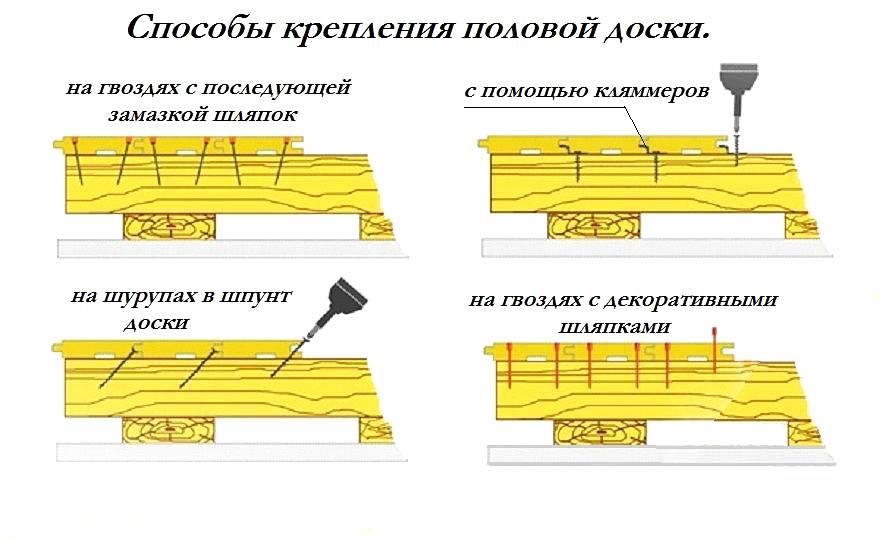 Наиболее популярный способ крепления – с помощью саморезов для крепления половых досок. Этот метод отличается высокой скоростью исполнения и долговечностью готовой конструкции.