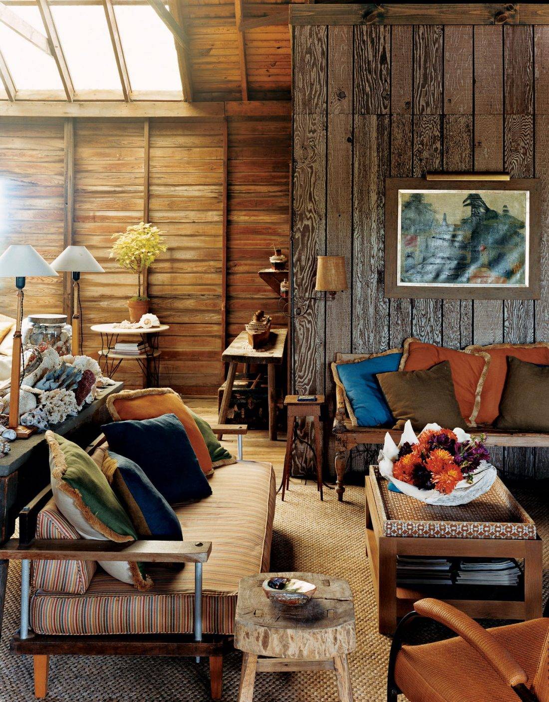 Без диванов в современном интерьере не обойтись, хотя в избах их, конечно, не было. Выбирайте диван простой формы с обивкой под лен. Цвет обивки — естественный природный. Кожаная мебель будет выбиваться из общей картины.
