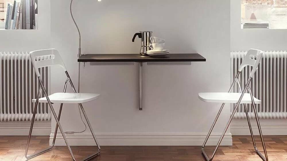Однако такую модель следует выбирать лишь в том случае, если семья состоит всего лишь из двух человек. Преимущества такого стола заключаются в том, что его можно прикрепить к одной из стен в небольшой кухне, и обойтись при этом всего одной парой ножек (такое решение позволит сэкономить немного пространства в помещении).