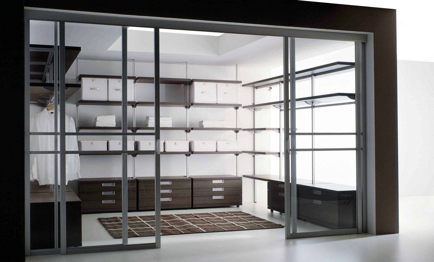 Гардероб состоит из множества полок, ящиков и разных систем хранения, которые в совокупности составляют единый большой стеллаж. Он может быть любой формы и состоять из единого блока или разных модулей, установленных поодаль либо рядом друг с другом.