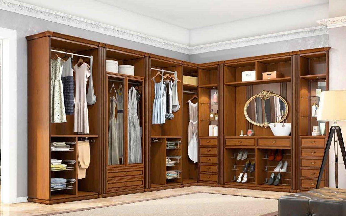 Для классического интерьера подойдет гардеробная, стеллажи которой выполнены из дерева. Фасады можно оформить МДФ или шпоном. Такая система хранения будет выглядеть дорого и величественно, поэтому больше подойдет для просторных помещений загородных домов.
