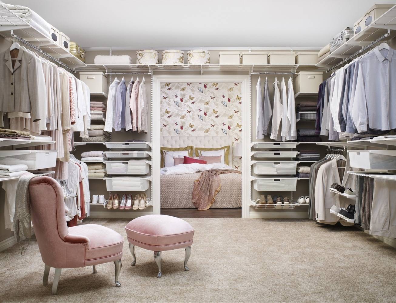 Гардеробная Эльфа (Elfa) — это целая комната, внутрь которой встраиваются полки, ящики, корзины, вешалки, брючницы и крючки для того, чтобы вешать аксессуары и сумки. Элементы шкафов выполняются из прочных материалов, благодаря чему корзины или полки способны выдержать нагрузки.