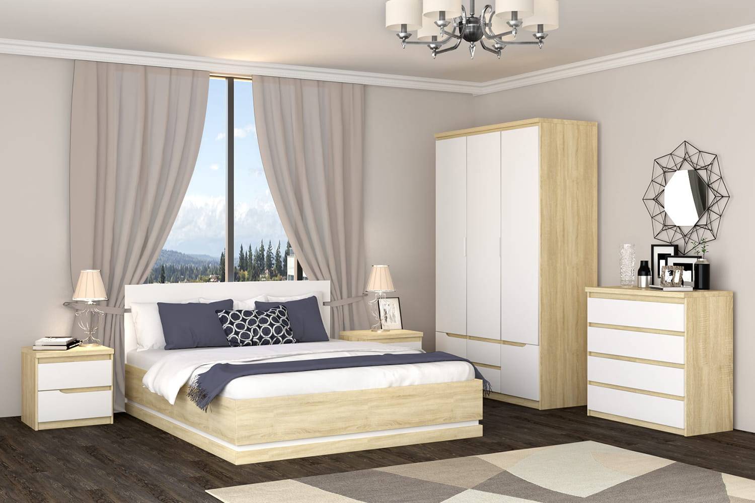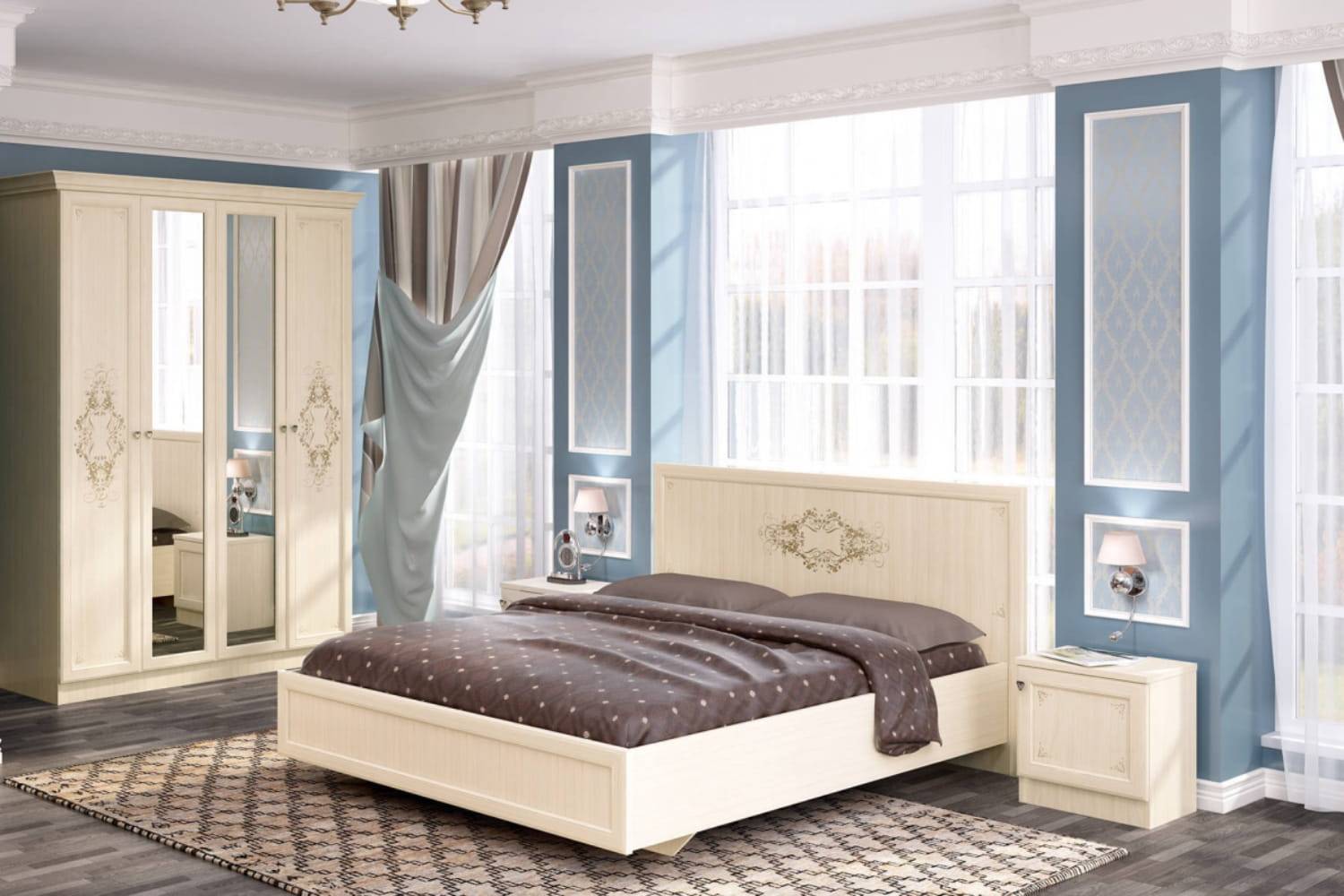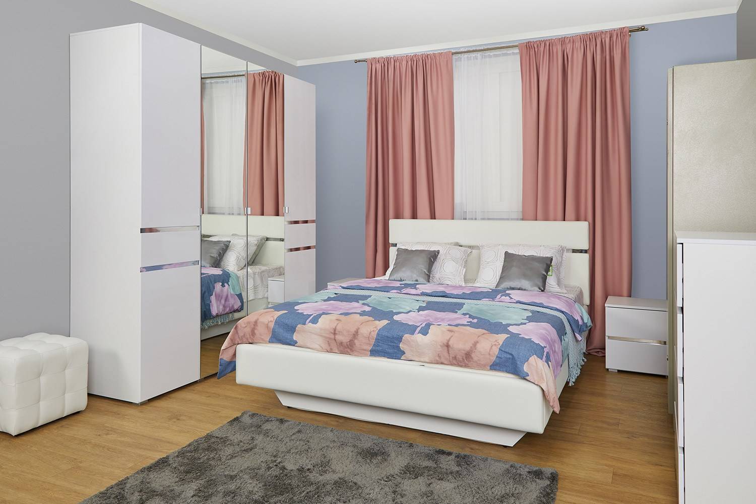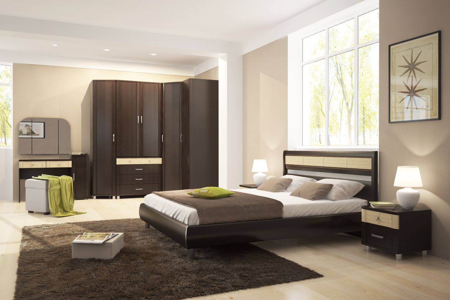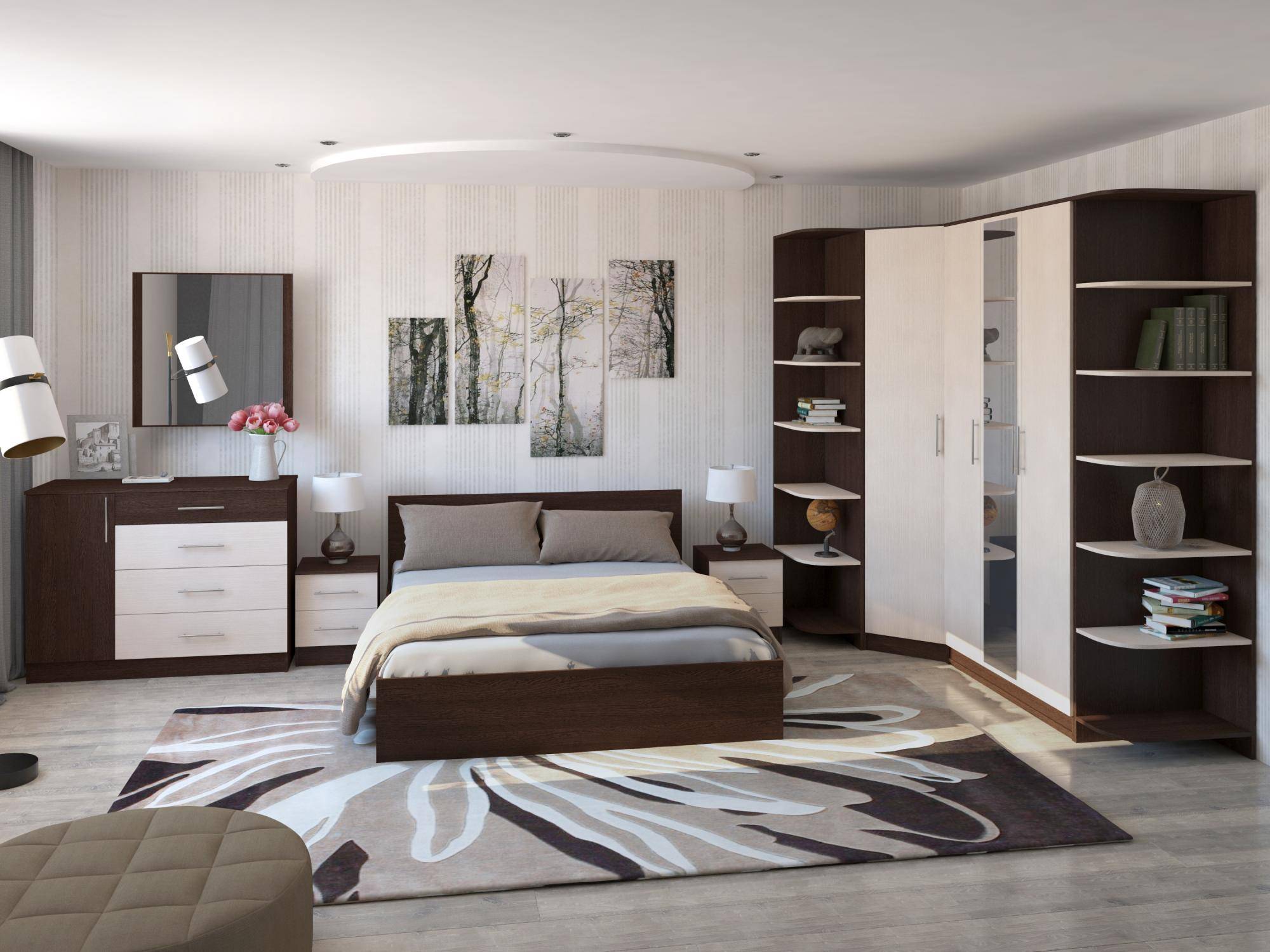 Единственным правилом размещения подобного гарнитура станет обязательное размещение самого большого шкафа в углу. Все остальные элементы могут быть расположены симметрично или совершенно не следовать правилу равноудаленности предметов относительно центра.