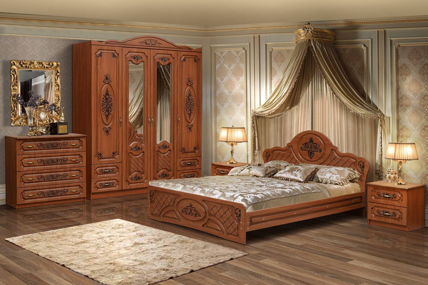 - ампир и барокко. Таким стенкам свойственны большие размеры и основательный внешний вид конструкции, поэтому они рекомендуются для обустройства спальни большой площади. Характерная черта – присутствие золотой фурнитуры;