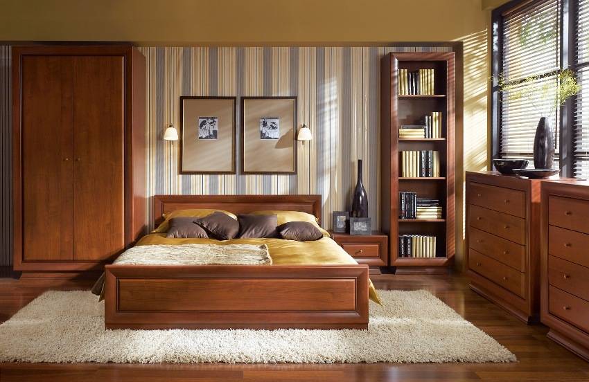 Деревянная конструкция отличается особой прочностью и вносит в спальню приятный аромат. Недостатками стенки из дерева можно считать высокую цену на готовые изделия, а также тот факт, что ей сложно придать какую-либо интересную форму.