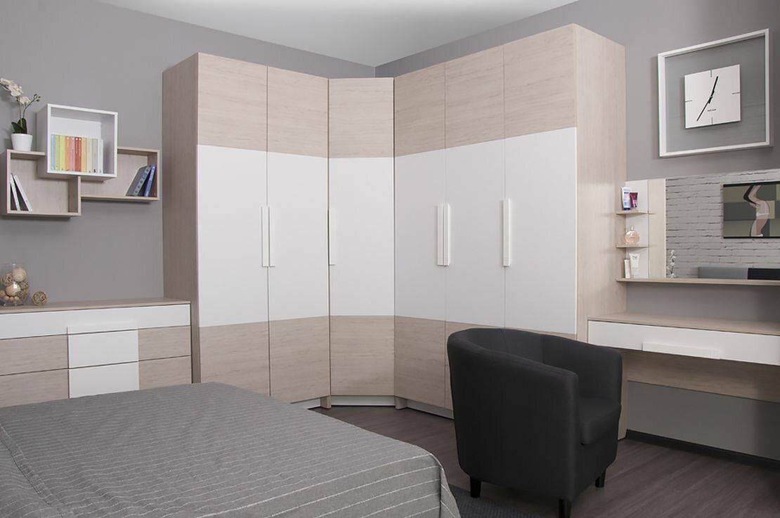 Спальни — это комнаты, которые надо оснастить только самыми необходимыми элементами. Реализации таких предположений способствует привлечение мебели с высочайшей функциональностью, например, угловых стенок для спальни. Их хорошо продуманная форма идеально вписывается в интерьер любого размера. Занимая только угол у стыка перпендикулярных стен, шкаф не мешает расположению, напротив, делает спальню уютной,а пользователя позитивно настраивает на весь день.