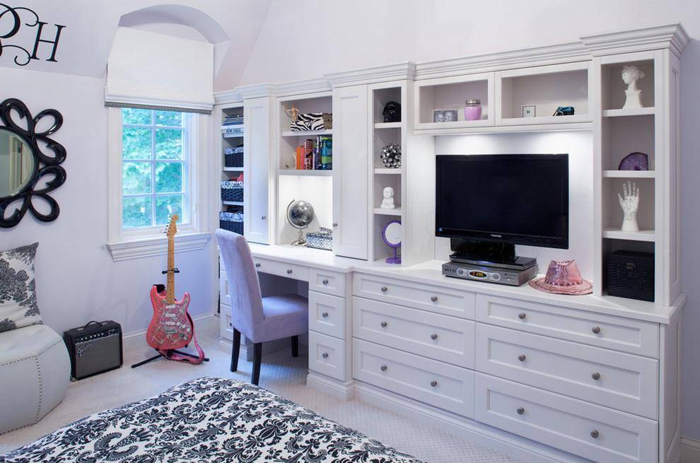 В просторной комнате легко установить мебельную стенку, включающую компьютерный стол. Такой набор состоит из нескольких шкафов разного назначения: для одежды, книг, канцелярских принадлежностей, бумаг, спортивного снаряжения, игрушек, обуви, постельного белья и др.