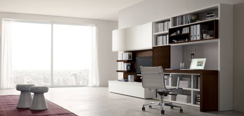 Модульный тип дает возможность менять предметы местами по своему желанию. Благодаря такому подходу удается легко вносить изменения в привычную обстановку. Некоторые секции компонуют возле стола, создавая полноценную рабочую зону, а остальные можно установить отдельно.