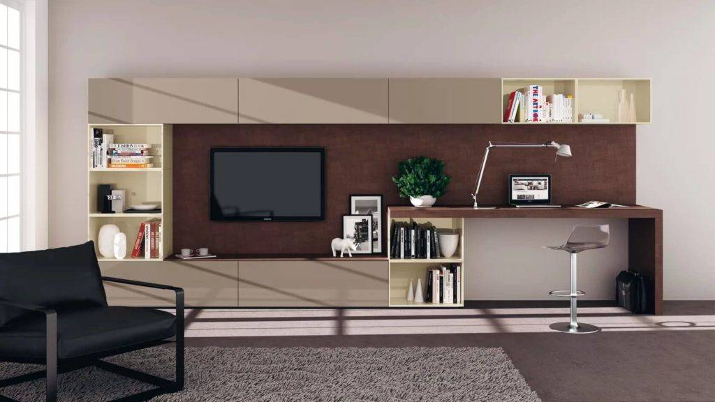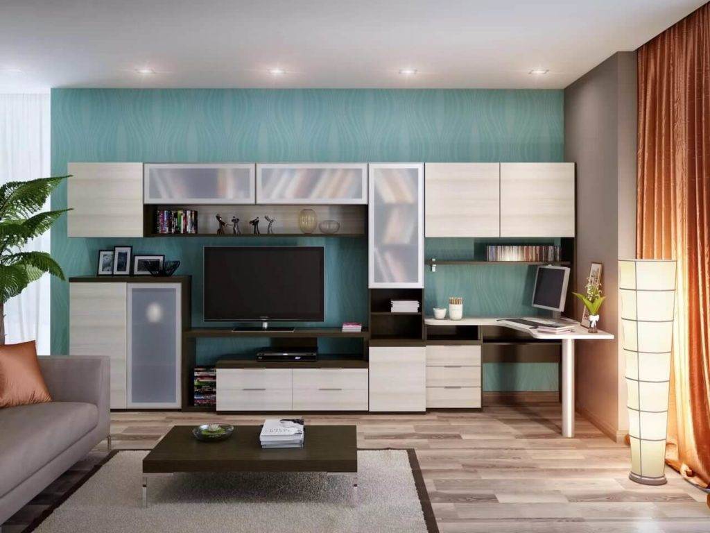Стенка в гостиную с рабочим местом может иметь разные модели. Для правильно выбора стоит учесть функционал стола и характеристики помещения.