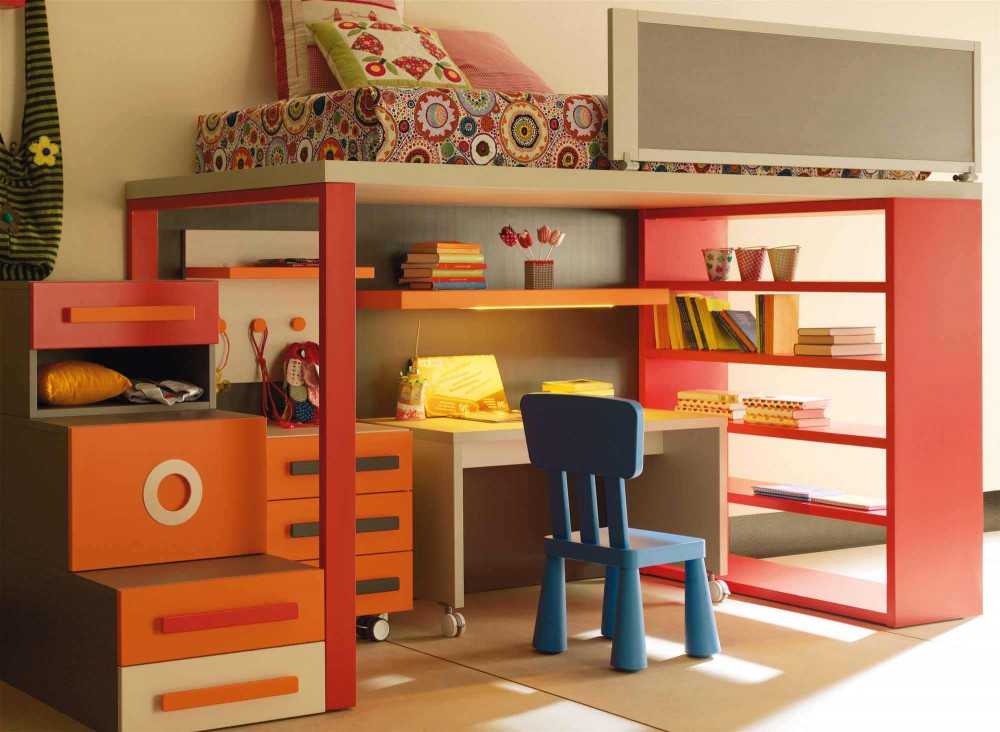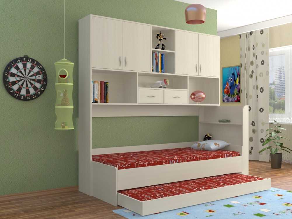 “Кровать-чердак”: кровать находится на втором ярусе, а под ним рабочее или игровое место. Для многодетных семей актуальны двухэтажные комплексы.