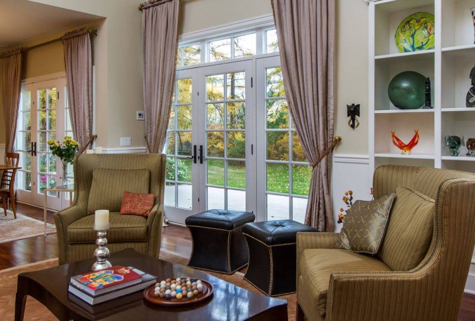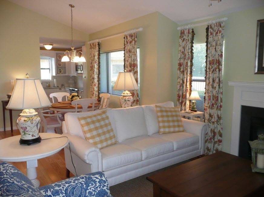 Гардины или портьеры с более крупными цветочными узорами прекрасно украсят гостиную и подчеркнут свойственную этому стилю мягкость и гармоничность.