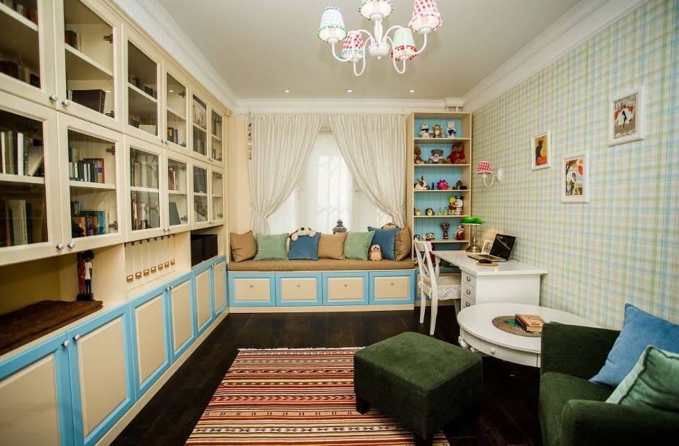 На фото шторы с тропическим узором на окнах в просторной детской, оформленной в стиле прованс.