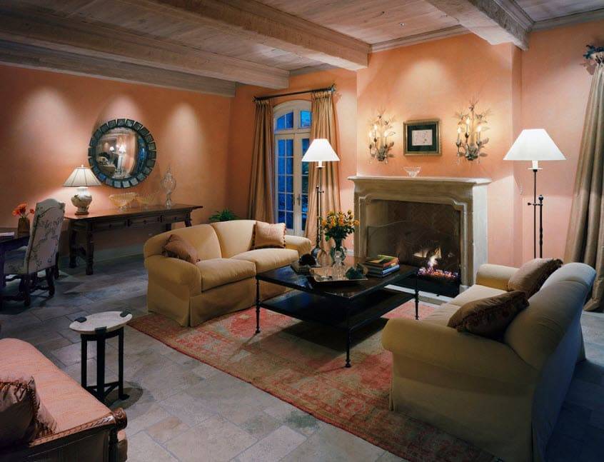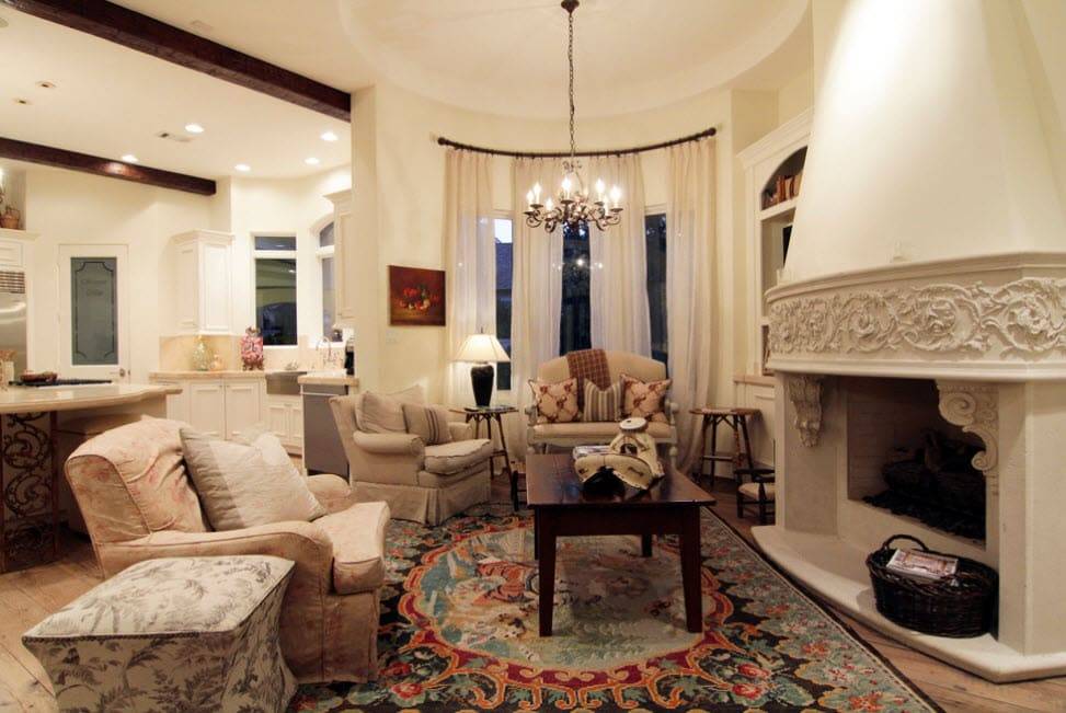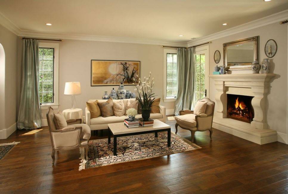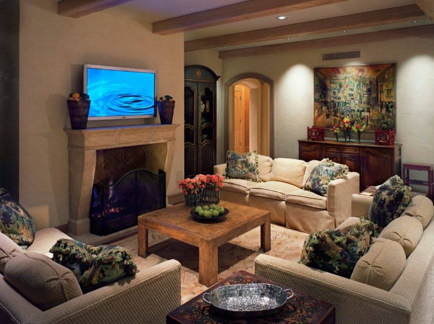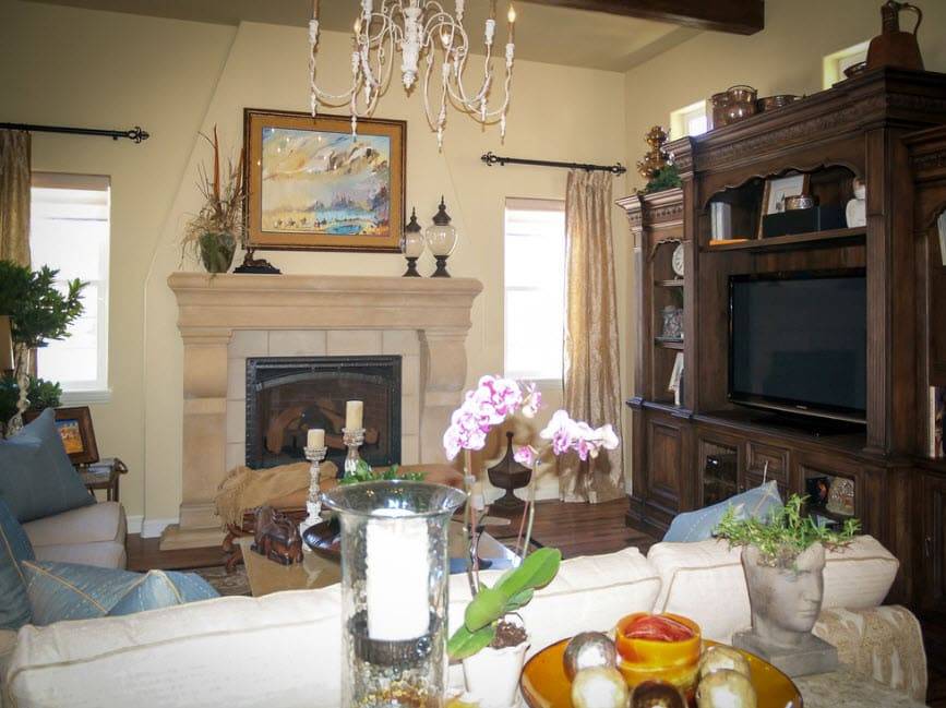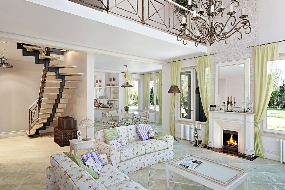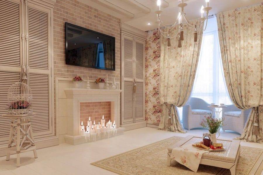 Мебель должна иметь характерную потертость и светлые оттенки. В качестве дополнения используются старинные альбомы с фотографиями, зеркала и картины в винтажных рамках. Также гармонично впишется в дизайн плетеная мебель, корзины и старые сундуки «с драгоценностями». Если в гостиной планируется прием гостей, то здесь нужно поставить круглый стол, покрытый клетчатой или вышитой скатертью с цветочным узором. Стулья должны быть металлическими, украсить их можно подушками с завязками. Обязательный атрибут гостиной – камин, возле которого приятно посидеть вечерком за чашечкой кофе, замотавшись в плед.