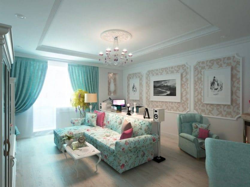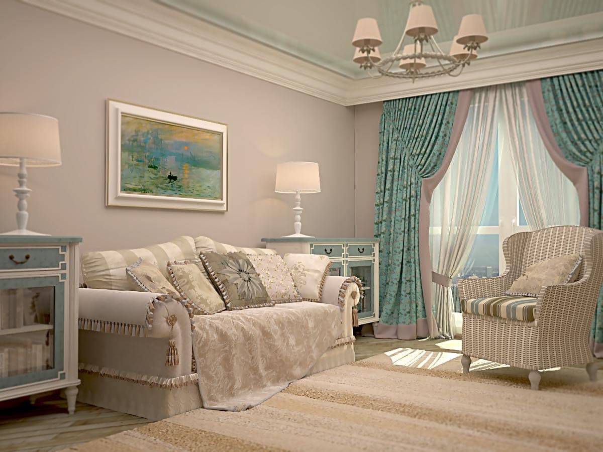 На фото гостиная в стиле прованс и портьеры с цветами на окнах.