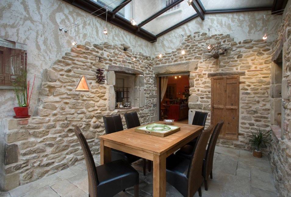 Отличительная черта стиля – потолочная деревянная объемная балка или несколько узких, идущих параллельно друг другу на одинаковых расстояниях балках. Помимо декоративной она может нести и практическую функцию – служить коробом для размещения электропроводки и других коммуникаций.