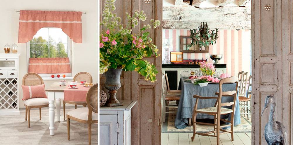 Текстиль, как и стены, мебель, посуда украшен уютным цветочным орнаментом. Он выдержан в теплых, неярких тонах, которые вызывают ощущение бабушкиного дома – радушия, уюта и отдыха, чего-то деревенского, нежного и немножко провинциального. Ткани предпочтительно выбирать хлопковые и льняные. Можно использовать различные виды кружев. Для стола выбирают льняную скатерть, украшенную цветами, клетками или полосками.