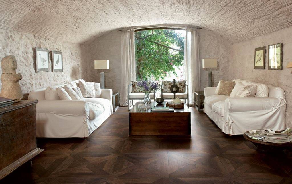 Что касается материалов, то они должны быть стопроцентно натуральными. Никакого пластика и ламината. В качестве полового покрытия подойдет паркетная доска, терракотовая плитка, камень, выбеленные деревянные доски.
