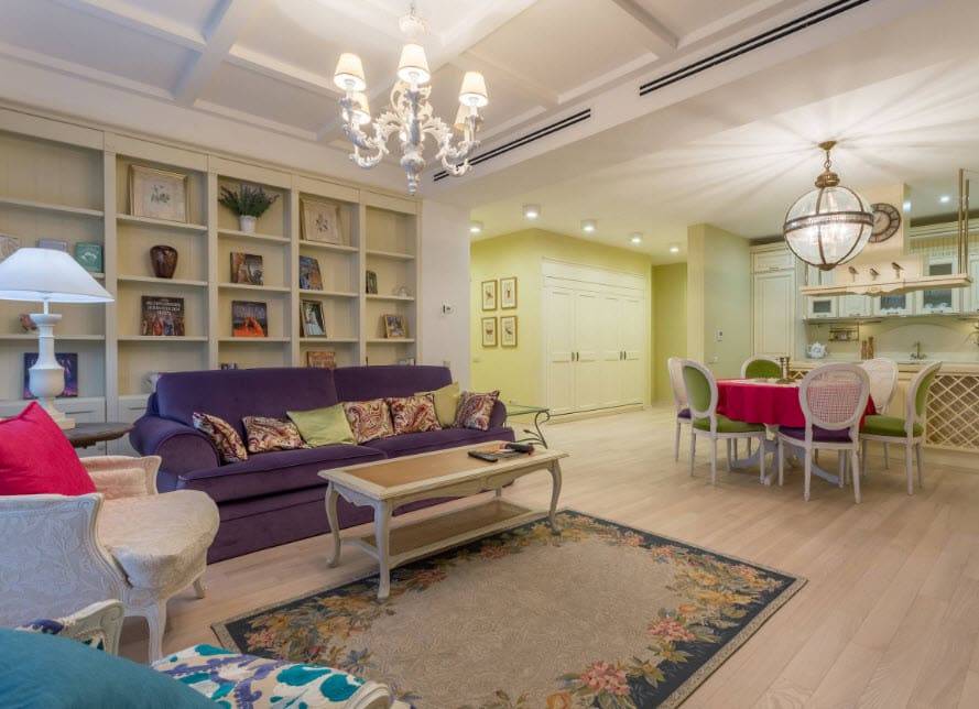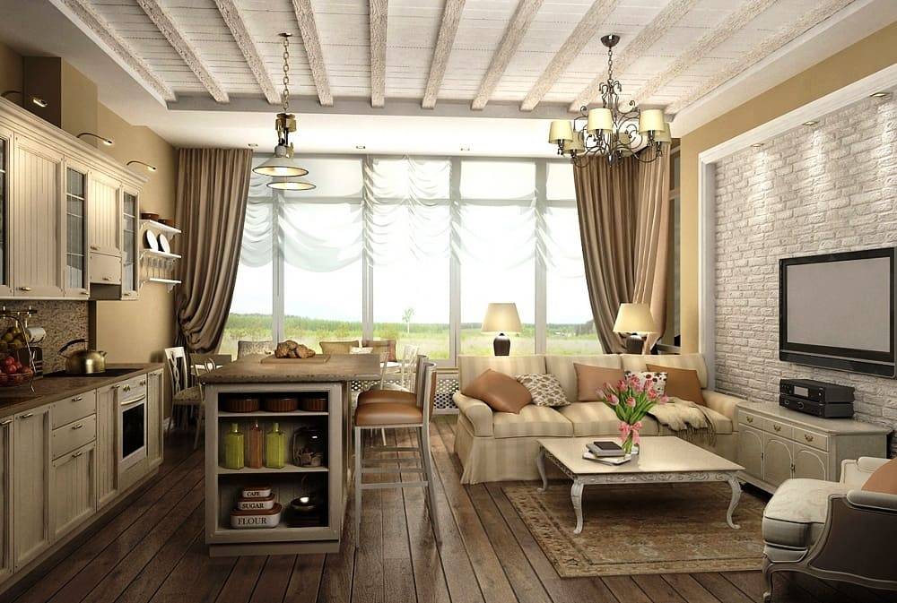 Оформив маленькую квартиру в стиле прованс, легко создать уютную атмосферу, расширить пространство, убрав все лишнее. Добиться этого можно небольшой перепланировкой, совместив гостиную и кухню. Зону столовой оградить балюстрадой и льняными шторами.