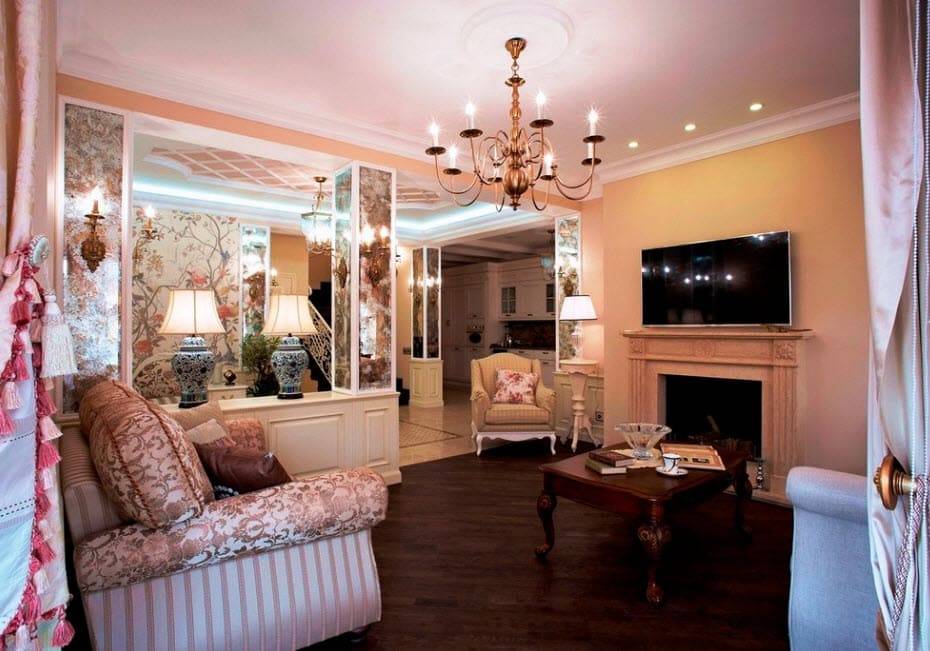 Важной частью декора являются зеркала, настенные часы, букеты в вазах. Зеркало в старинном, венецианском стиле можно повесить в спальне, а на стене в гостиной – большие часы