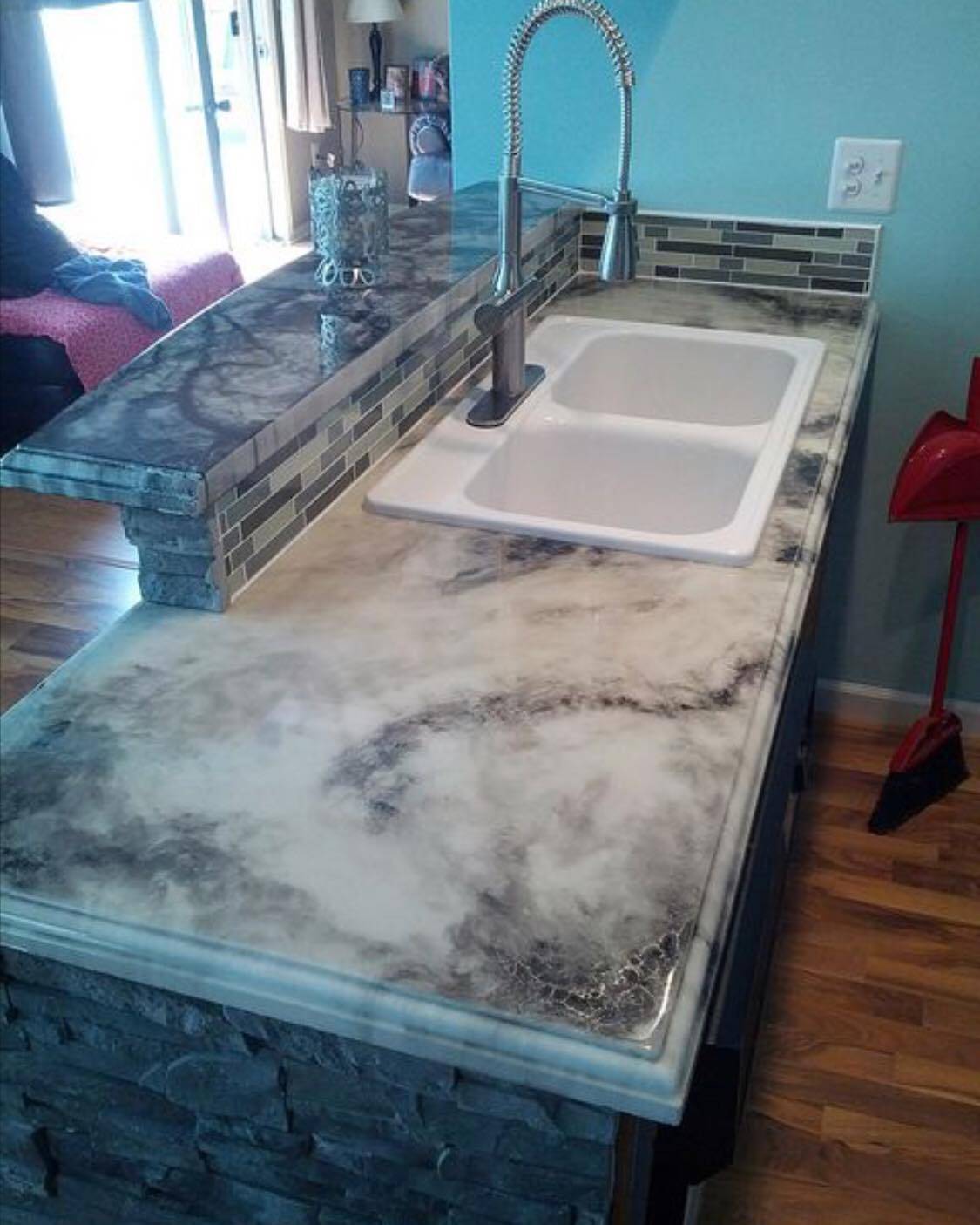 “Мраморная” столешница из обычного бетона смотрится эстетично и изыскано.