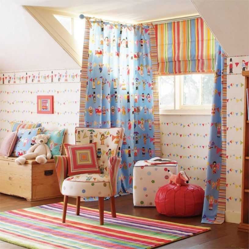 Выразительнее полотнища будут смотреться, если приобрести их в похожем дизайне, акцентирующем одну из зон детской (например, спальную или игровую). Например, это может быть панно над письменным столом, постер или даже детский рисунок. Взяв что-то из такого акцента (скажем, цвет, технику рисунка, его тематику и настроение), можно выразить увлечения уже подросшего ребенка. Для мансарды, которую сегодня нередко оформляют под детскую, можно взять рольшторы, варианты плиссе или же классику. Поскольку окна в такой комнате зачастую наклонные либо даже горизонтальные, придется продумывать крепления для полотнищ, чтобы они не свисали перпендикулярно полу. Если хочется купить длинные шторы на люверсах, достаточно подобрать к ним нижнюю планку в одном дизайне с карнизом, чтобы перехватить свисающие полотна, закрывая тканью окна. Отлично закрывают такие оконные проемы рольшторы на дистанционном управлении.
