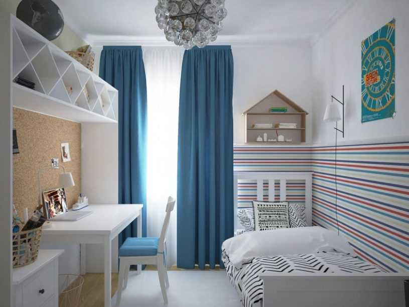 - «Морские волны». Чтобы детская комната передавала настроение волнующейся морской воды, выберите шторы с полосами. Линии могут быть широкими или узкими, изогнутыми или прямыми, горизонтальными или вертикальными. Во всех случаях они придадут детской атмосферу морской свежести и свободы. Старайтесь выбирать ткань с полосами голубых и белых оттенков. Для морского стиля не подойдет черный цвет: он придаст комнате мрачности. Чтобы создать более веселое настроение, к традиционным белым и синим полосам можно добавить 1-2 красных. При таком оформлении следует строго соблюдать меру, иначе комната станет пестрой.