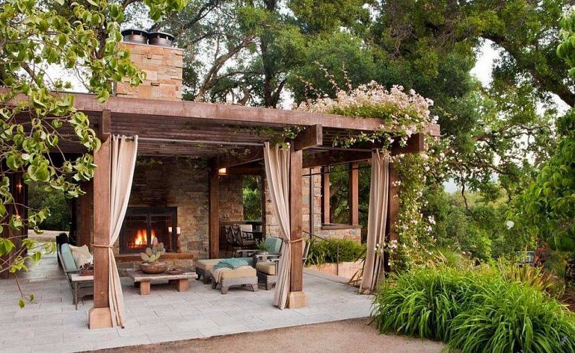 Еще одно направление, близкое к русскому: рустикальный стиль. Если бревна постройки в русском стиле гладкие, то здесь обработка дерева нарочито небрежная. В некоторых случаях даже делается браширование древесины, чтобы предать ей большую рельефность. В том же роде подбирается и внутреннее убранство: мебель примитивная, зачастую топорная, а текстиль, которым декорируется дачная беседка, из грубых льняных тканей.