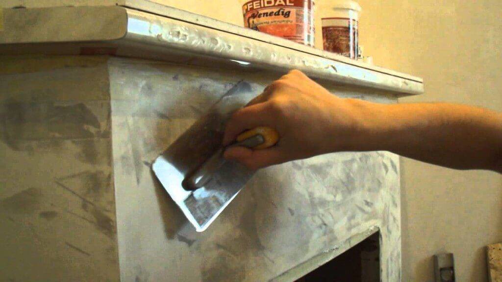 Камины, как правило, делаются в гостиных комнатах. Поэтому их внешний вид – особая забота владельцев. Можно после выравнивания раствором для штукатурки печки заштукатурить каминный короб декоративными составами с эффектом травертин, мрамор (венецианская штукатурка) или др.