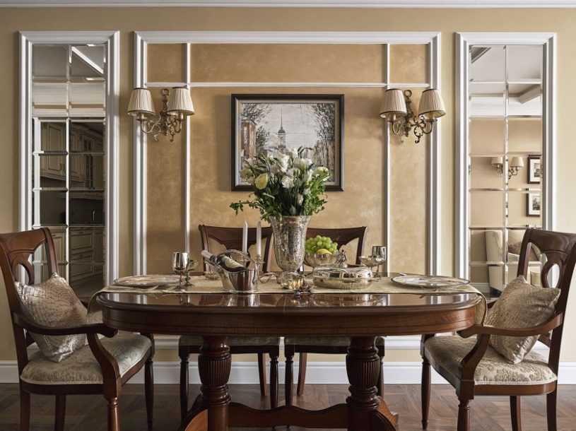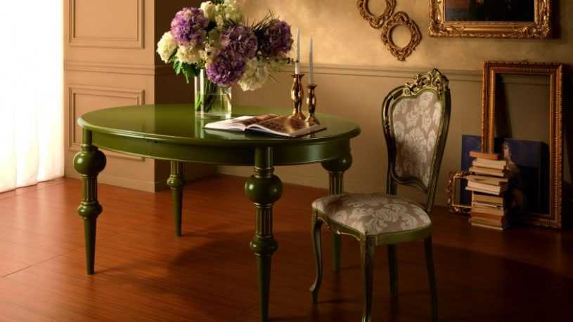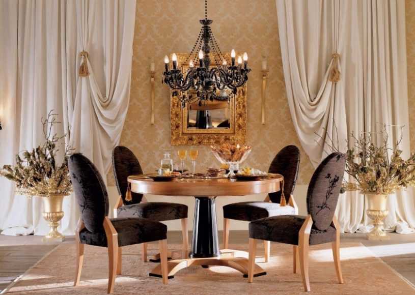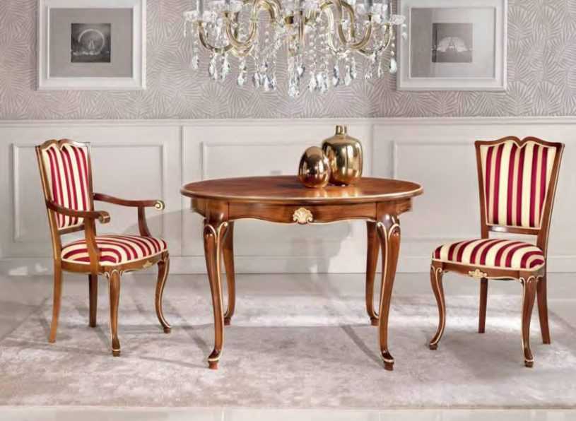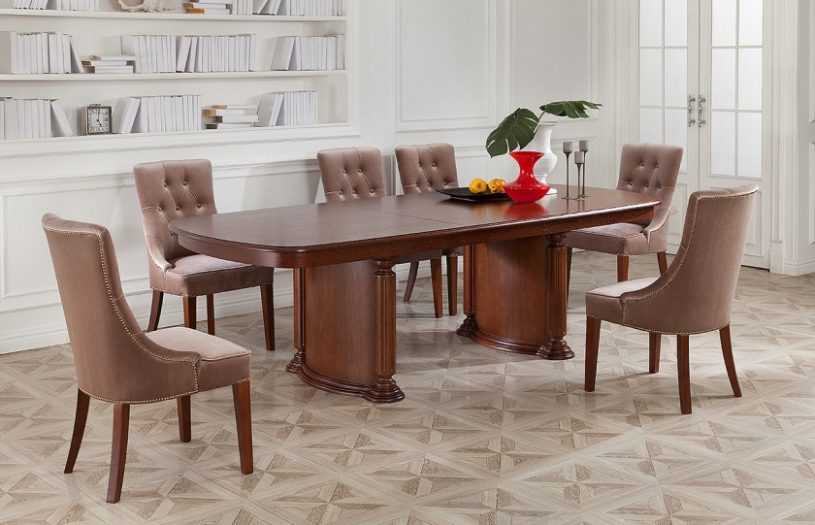 - классический – для обеденного стола нужны только традиционные стулья или полукресла. Для изготовления мебели в классическом стиле используется древесина твердых пород – дуб, бук, ясень, орех, дорогая, но сдержанная по дизайну отделка – замша, однотонный бархат, парча. Допускается резьба;