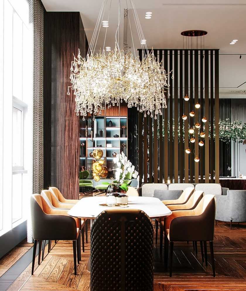 1. Многие дизайнеры не рекомендуют ставить мебель вдоль стен, а использовать принцип зонирования. Например, красивые стулья и стол, выставленные посредине гостиной, однозначно указывают на обеденную зону. Она может быть органично дополнена низко свисающим над столом светильником. Это добавит интерьеру особой доверительной атмосферы, располагая к длительным застольным беседам.