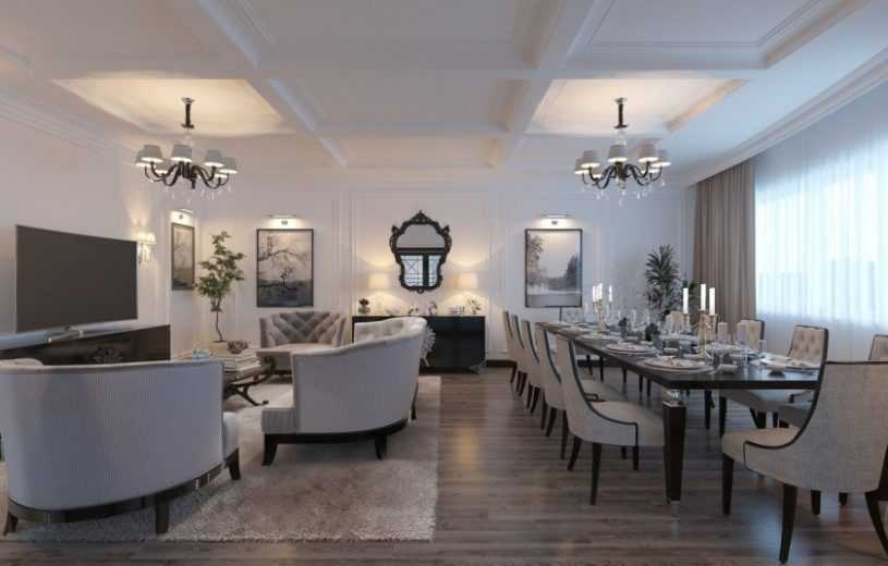 Дизайн гостиной в классическом стиле на современный лад реализуют разными материалами – здесь уместны натуральные поверхности, но и от искусственных отказываться необязательно. В этом направлении можно смело использовать синтетические покрытия, которые качественно имитируют природные, оставаясь при этом и безопасными для здоровья людей.